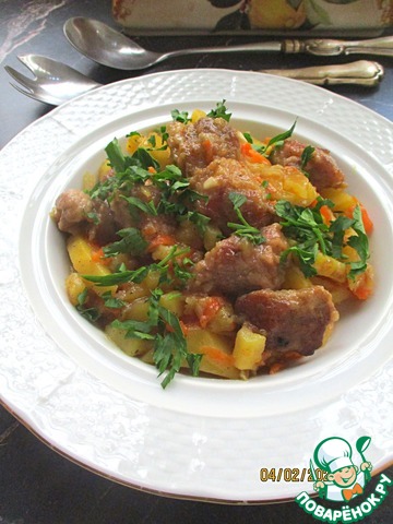 Вместо воды можно добавить оставшуюся жидкость от сырого картофеля. Перемешать мясо с овощами и соусом и пару минут прогреть. -