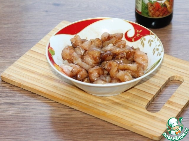 2. Залить филе соусом Терияки, перемешать и оставить на полчаса.