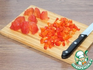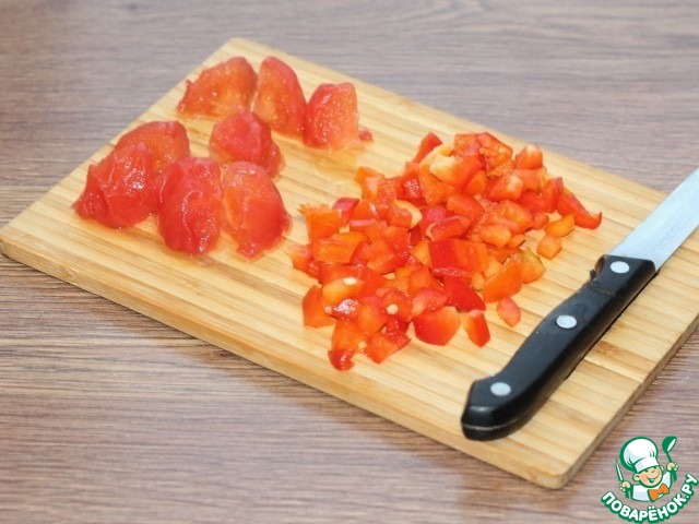 3. Очищаем овощи. На помидоре сделать надрез, залить кипятком, оставить на 1 минуту. Затем помидор остудить, снять кожицу и нарезать дольками. Мелко нарезать сладкий перец.