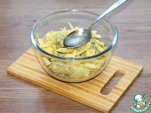 5. Картофель порезать соломкой и посыпать приправой для овощей, добавить 1-2 ст. л. растительного масла и перемешать.