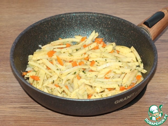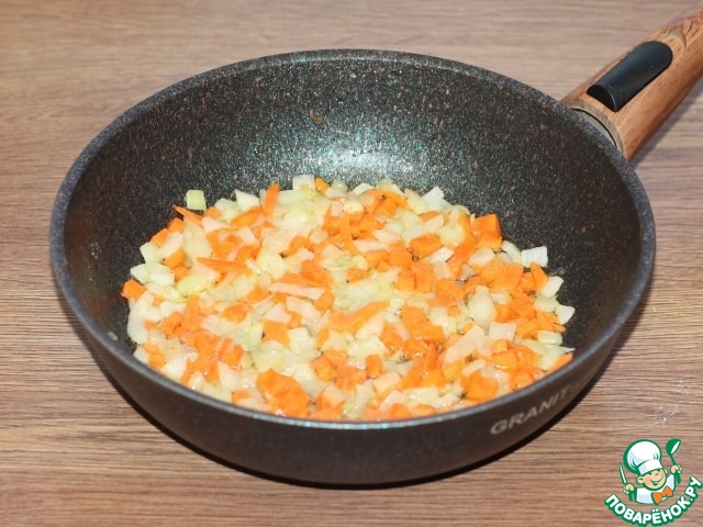 9. Добавить в сковороду растительное масло и выложить лук. Жарить на среднем огне, минуты 3 и добавить морковь.