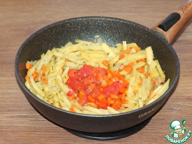 11. Добавить помидор и сладкий перец, уменьшить нагрев и тушить овощи почти до готовности.