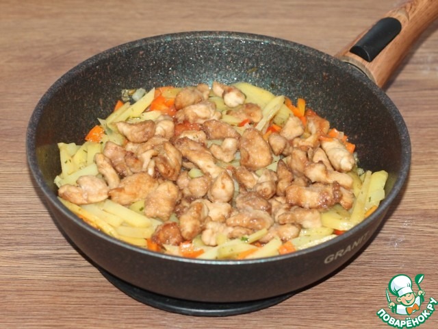 10. Через 3 минуты добавить картофель и мелко порубленный чеснок, посолить и поперчить. Обжарить овощи на среднем огне до полуготовности картофеля.