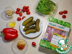 Легкий и вкусный салат с бужениной из индейки, маринованными огурчиками, болгарским перцем, сладкими помидорами черри, сочной микрозеленью, заправленный горчично-медовым соусом! Необычное сочетание и пикантный вкус!