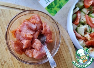 Оливковое масло, соль, перец, копченую паприку смешать, индейку порезать на небольшие кусочки, смешать с маринадом.