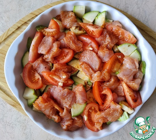 Кабачок помыть, порезать, уложить в смазанную оливковым маслом форму.