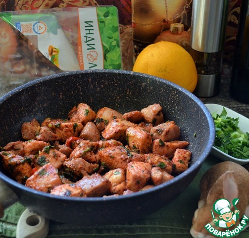 Индейку нарезать на куски, размером с грецкий орех. Добавить паприку, сумах и соль,
