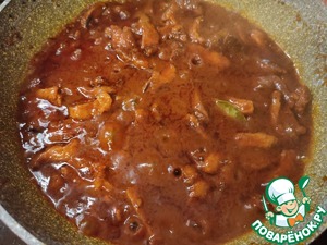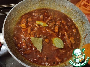 Наливаем в сковороду 300 мл горячей кипячёной воды, перемешиваем, добавляем несколько лавровых листиков. Уменьшаем нагрев и накрываем сковороду крышкой. Тушим 15-20 минут на небольшом огне, периодически помешивая