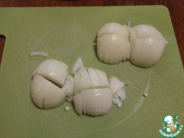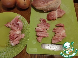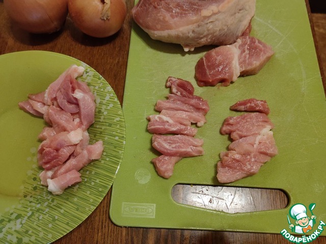 Мясо режем брусочками толщиной около 1 см, и длиной 3-4 см.