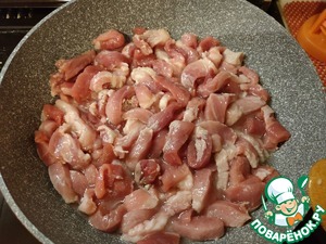 Наливаем в сковородку растительное масло, ждём пока она хорошо нагреется и выкладываем мясо. Жарим на сильном огне.