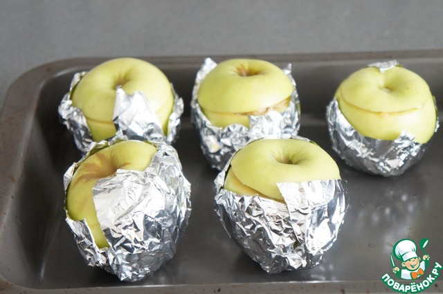 Поставьте яблоки в духовку, можно дно обернуть фольгой по желанию, чтобы сок не вытек. Выпекайте при 160 градусах около 40 минут. Почему так долго? Чтобы яблоки не развалились, их выпекают при низкой температуре.