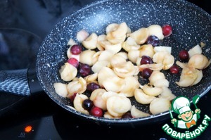 А я взяла половину, добавила немного клюквы, слегка припустила на сливочном масле на сковороде. Добавила мукатный орех, корицу, сахар и коньяк. Выпарила, добавила воды. -