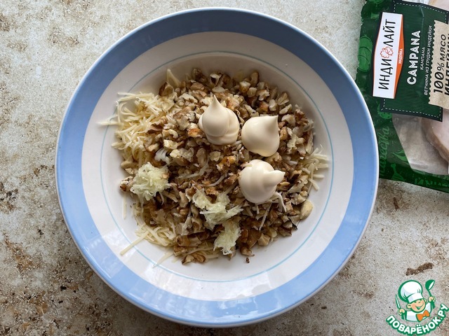 Соединить натертый сыр, измельченные орехи, измельченный чеснок.