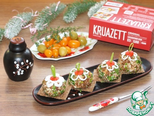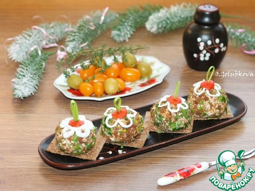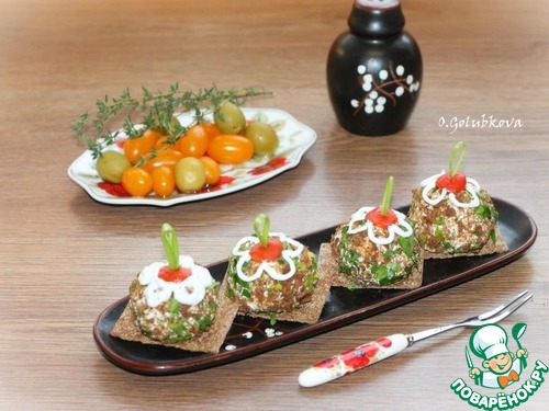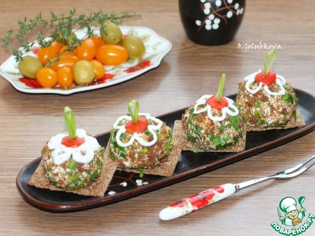 • 10. На половинки хлебцев, кладем шарики. Украшаем шарики красным перчиком (кружочки), перышком чеснока (или лука) и рисунком из майонеза.