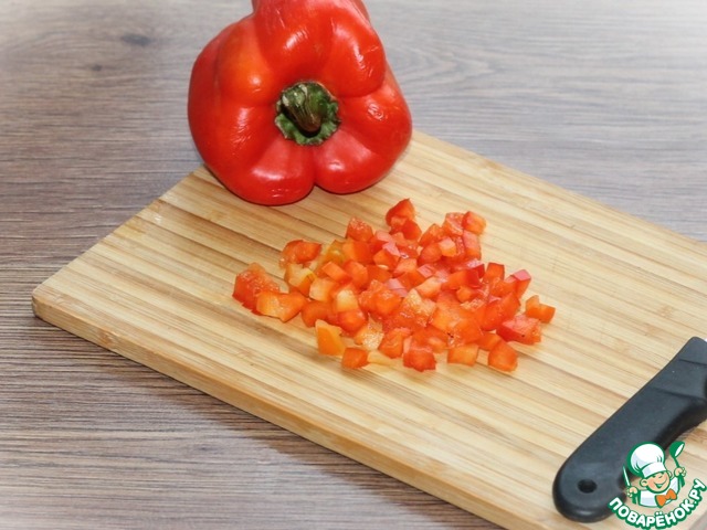 • 2. Очищаем перец от семян и вырезаем 4 кружочка (для украшения), остальной перец нарезаем маленькими кубиками.