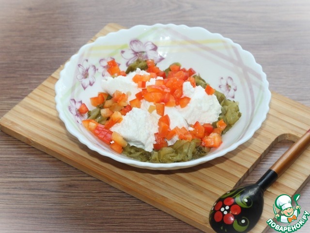 • 3. Смешиваем творог со сладким перцем и огурцом.
