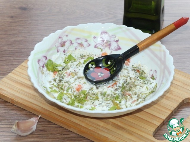 • 4. Добавляем 1 ч. л. оливкового масла, прессованный зубчик чеснока и приправу, солим и перчим. Перемешиваем и охлаждаем в холодильнике, минут 15.