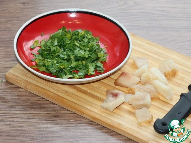 • 5. Рыбу нарезаем небольшими кусочками. Зелень мелко режем.