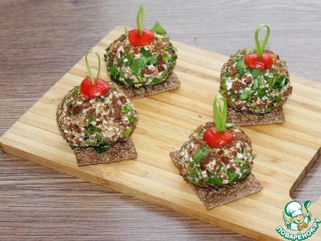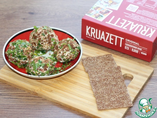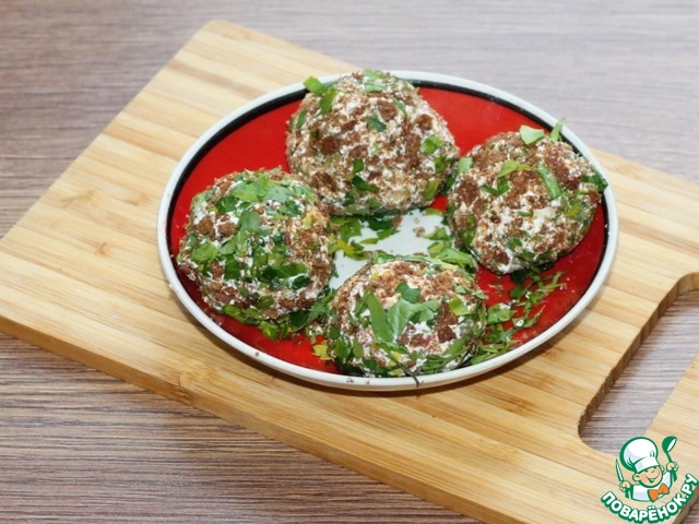 • 8. Закрываем рыбку паштетом и формируем шарики. Обваливаем шарики вначале в молотых хлебцах, а затем в зелени.