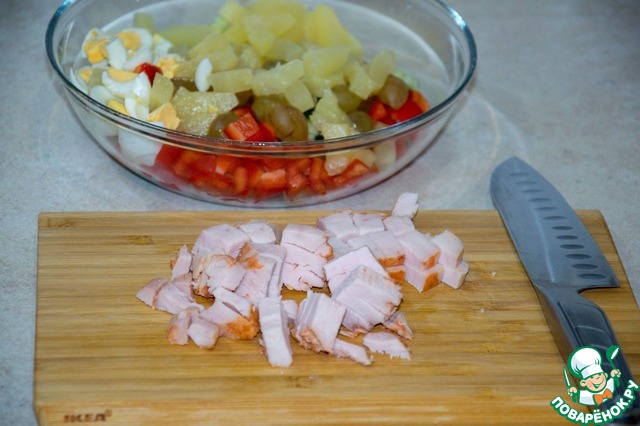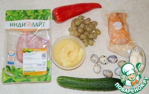 Подготовить все ингредиенты. Можно добавить соль и перец, но так как в составе копченная курица и майонез, мне этого вкуса было достаточно.