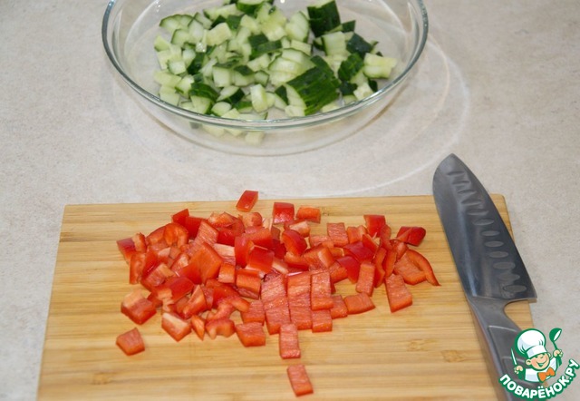 Нарезать огурцы и болгарский перец. Переложить в салатник.