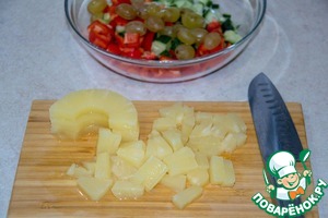 Порезать пополам виноград и ананасы на кусочки, отправить в салатник.