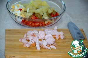 Нарезать перепелиные яйца и копченую куриную грудку.