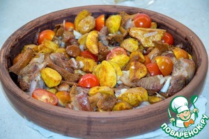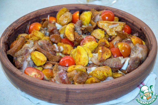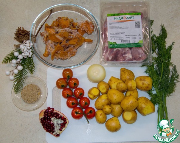 Семейное, сытное горячее блюдо из индейки, картофеля бэйби, томатов черри и лисичек. В этом рецепте использовала рагу из индейки "Индилайт". Однажды я попробовала в грузинском ресторане это блюдо, и оно осталось в списке любимых. Экспериментирую с ингредиентами, но всегда получается вкусно! Предварительно все обжариваю (кроме помидор), затем запекаю в кеци (блюдо получается еще вкуснее). Можно и на праздничный стол и просто на обед или ужин.