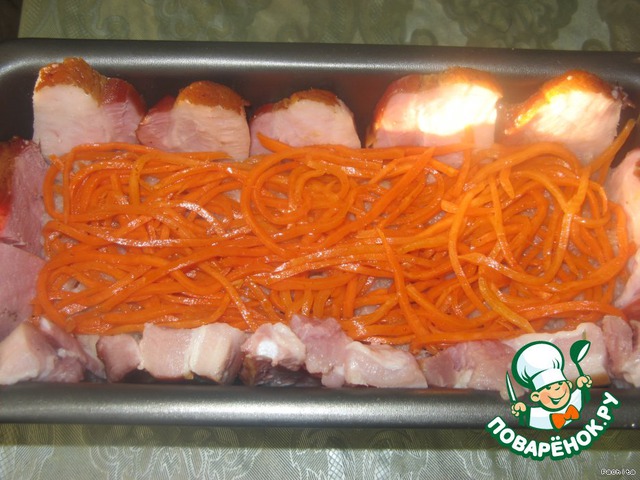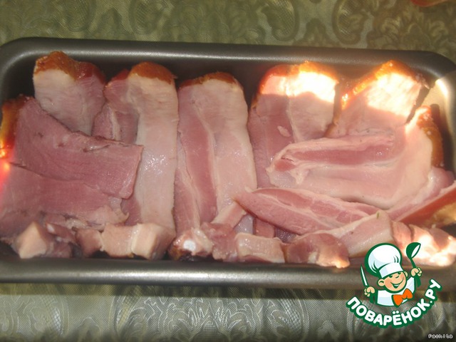Грудинку нарезать полосками, выложить дно и стены формы.
