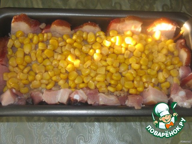 Снова фарш. Закрываем сверху полосками грудинки, кладем по всей поверхности масло.