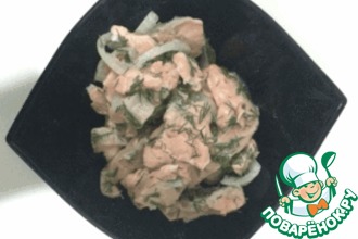 В чашке смешайте тунец, нарезанные лук, огурцы. Добавьте творожный сыр, всё перемешайте. Если понадобится, добавьте жидкость от тунца.