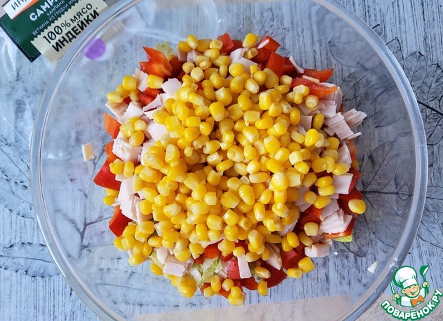 • С консервированной кукурузы слейте лишнюю воду. Добавьте в салат.