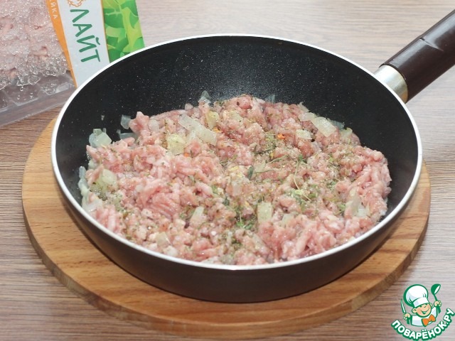 4. Добавляем смешанный фарш и приправу для мяса, солим и перчим. Жарим до готовности мяса.