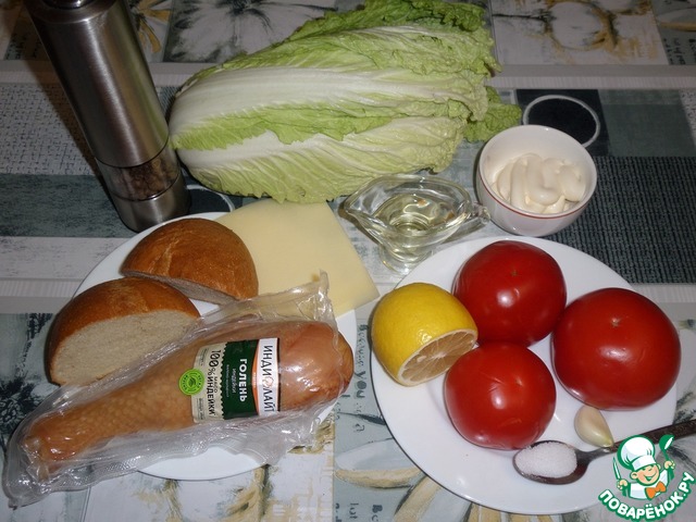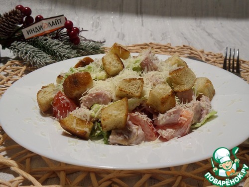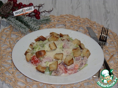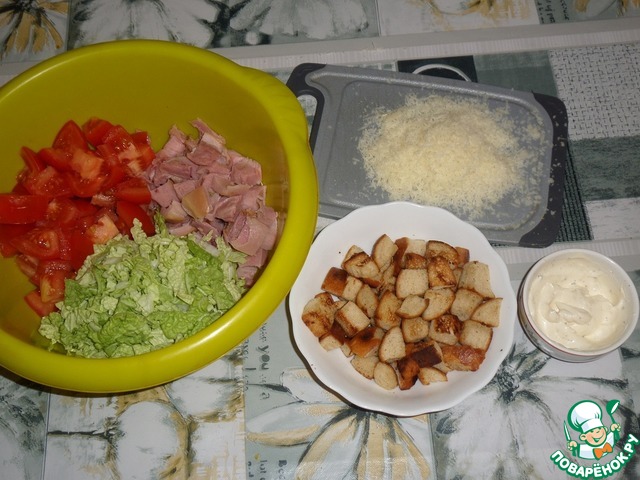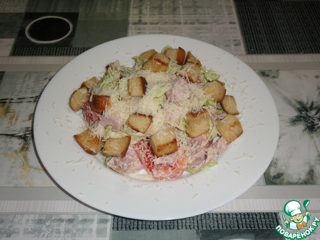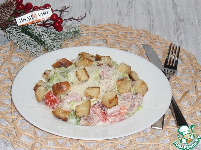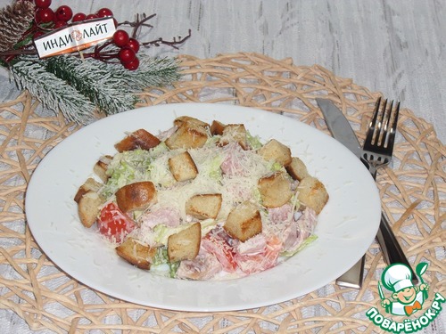 Как по мне - одна из разновидностей "Цезаря". Батон обжаривать в чесночным масле - ну, так себе, жирновато. Поэкперементировал с готовыми сухариками (и пшеничными, и ржаными) и чесночным порошком. Вполне себе замена. Можно сухарики и самому сделать, не обжаривая в масле. Пекинка должна быть сочной. Иначе совсем не то. И кому не нравится вкус копчёности и хочется по-диетичней - просто отварите бедро или голень индейки. Или курицы. Тоже не плохо получается.