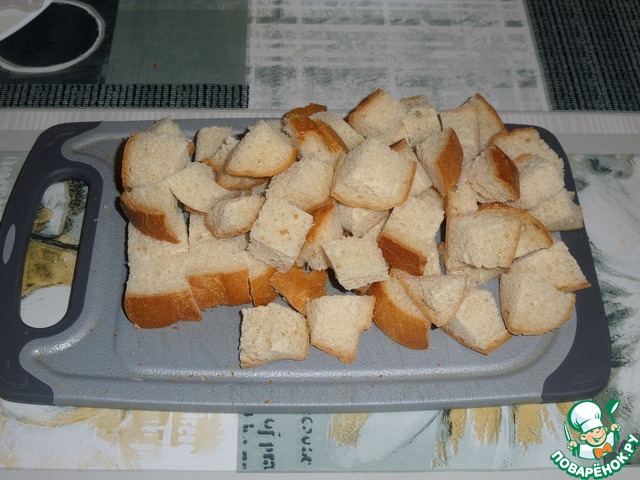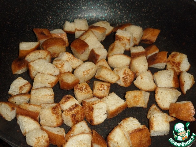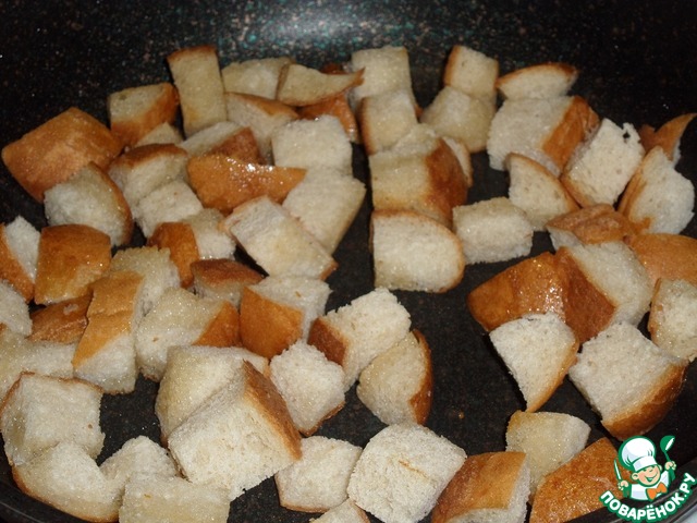 Обжариваем кубики батона до золотистой корочки, помешивая их. Затем убираем сковороду с огня. Сухарики перекладываем в миску. Остужаем.