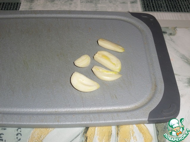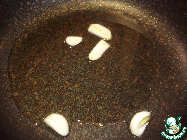 Сковороду хорошо разогреваем на огне. Наливаем растительное масло. Кладем в сковороду нарезанный чеснок. Обжариваем его 1 -2 минуты и убираем из сковороды.
