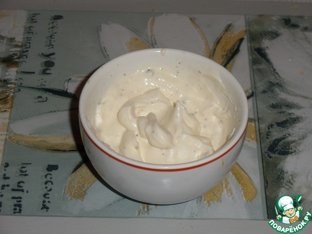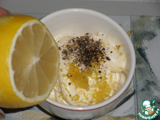 Готовим заправку для салата. В миску к майонезу добавляем цедру и сок половины лимона, перец черный молотый по вкусу.