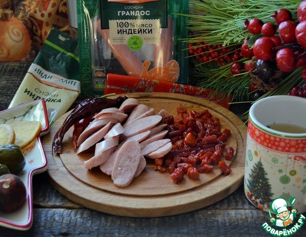 Приготовить продукты, чем разнообразнее колбасные изделия, тем вкус готового блюда богаче, интереснее. Рекомендую взять не менее 4 наименований.