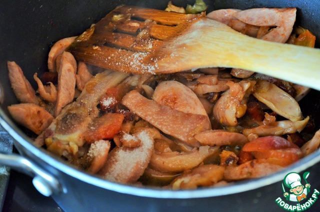 • Жарить 3 минуты, помешивая, добавить 1 ч. л. сахара.
