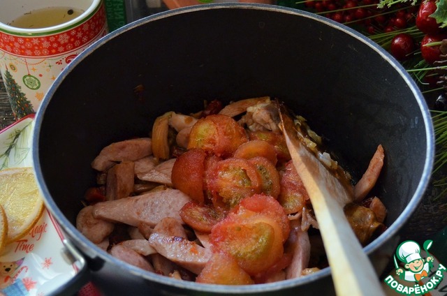 Нарезать копчёные колбаски и сосиски, добавить в сотейник, обжарить ещё несколько минут, перемешивая.