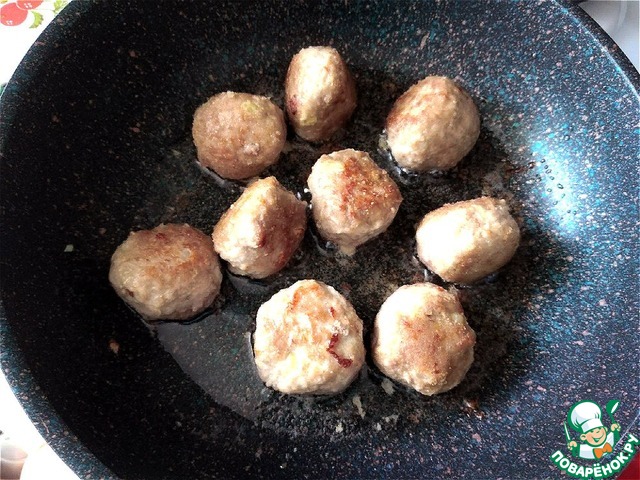 Начинаем жарить фрикадельки. Наливаем масло на сковороду, хорошо его разогреваем и выкладываем фрикадельки. Убавляем огонь на средний. Жарим фрикадельки, периодически переворачивая с боку на бок.