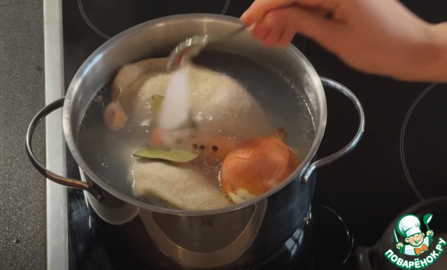 Процедить бульон, оставить листовой желатин на 5 минут в холодной воде для набухания, после чего добавть его в горячий бульон (около 950мл)и хорошо перемешать