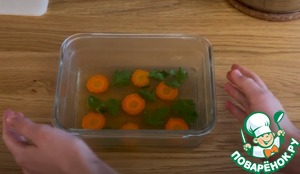 После застывания смеси, сделать второй декоративный слой, я в качестве декорации использовала нарезанную морковь и петрушку, хотя тут можно эксперементировать. Дать застыть