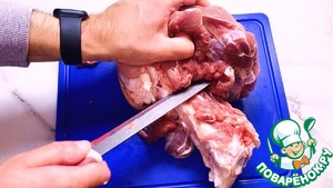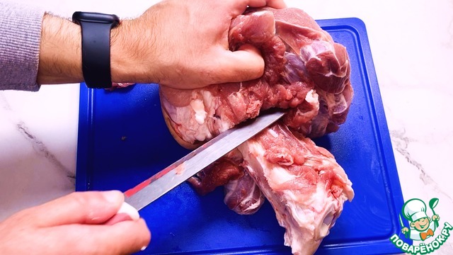Первым делом у свиной рульки вырезаем кость.