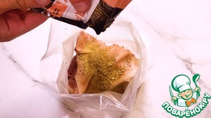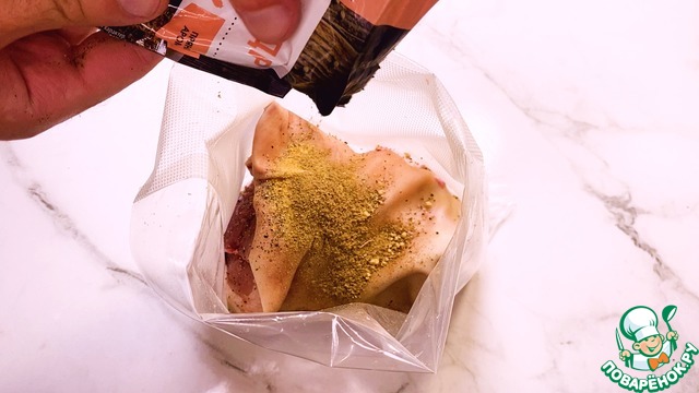 Затем свинину отправляем в вакуумный пакет приправляем мясо специями.