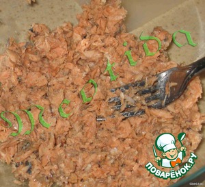 консервы разминаем вилочкой (жидкость надо всю слить..можно оставить 1 ч.л., если рыбка суховата)