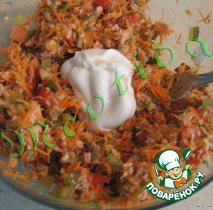 смешиваем рыбку с морковочкой, помидорчиком, укропчиком, огурчиком и заправляем горчицей со сметанкой (или можно взять легкий майонез)