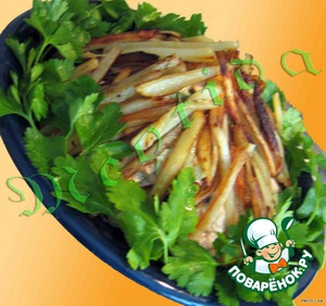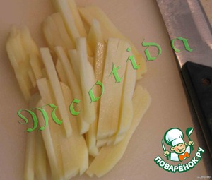 картофель нарезаем длинной соломкой и обжариваем в небольшом количестве растительного масла до золотистого цвета