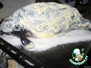 Единственная сложность - переложить его в блюдо: нужно сначала отбить куски соли, прилипшие к теше, а потом аккуратненько перенести на блюдо.