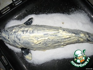 Высыпать на противень соль по диагонали так, чтобы вся рыба поместилась, и поставить ее на брюшко